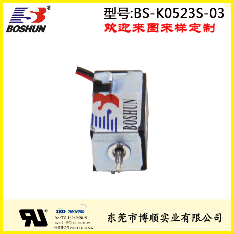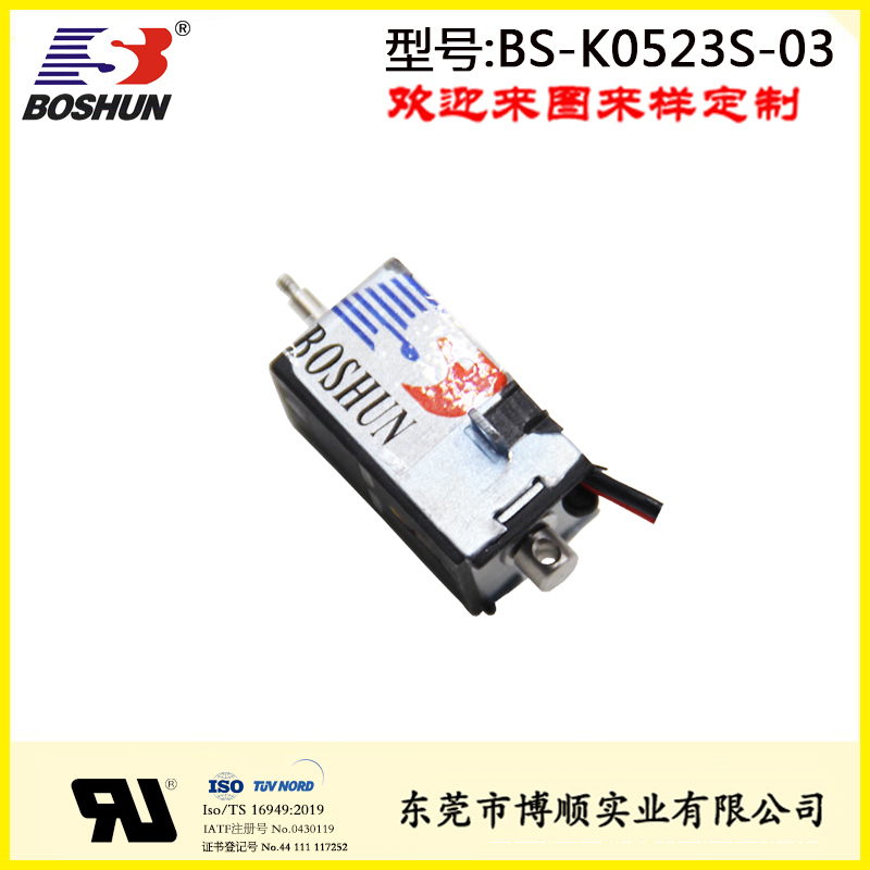 售票機電磁鐵 BS-K0523S-03是由東莞博順電磁鐵廠家研發設計并生產的一款電磁鐵,此類雙向自保持式電磁鐵用于實體售票機上,具有結構可改,參數可調優點。