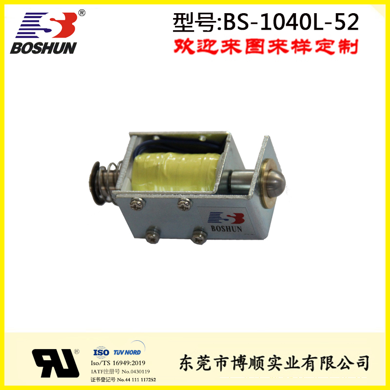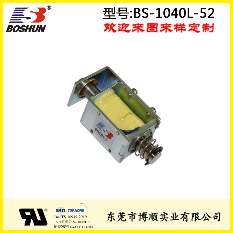無人駕駛車門鎖BS-1040L-52是由東莞博順電磁鐵廠家研發(fā)設(shè)計(jì)并生產(chǎn)的一款電磁鐵,此自動(dòng)門鎖電磁鐵用在汽車門上,具有結(jié)構(gòu)可改,參數(shù)可調(diào)優(yōu)點(diǎn)。