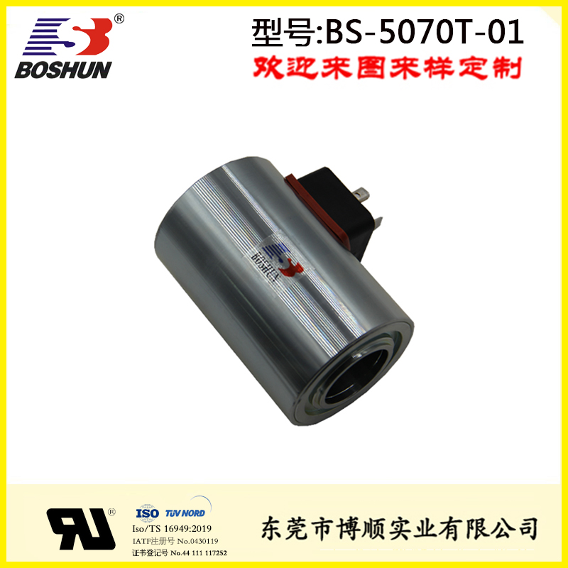 機械設備電磁鐵 BS-5070T-01是由東莞博順電磁鐵廠家研發設計并生產的一款電磁鐵,此類電磁鐵用于機械設備上,具有結構可改,參數可調優點。