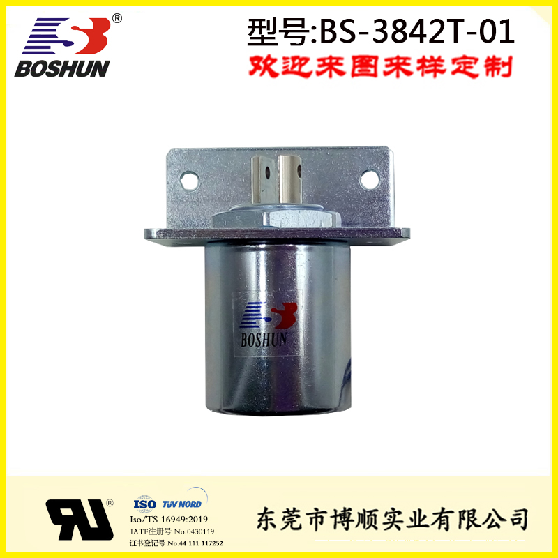 醫療設備電磁鐵BS-3842T-01是由東莞博順電磁鐵廠家研發設計并生產的一款電磁鐵,此電磁鐵用在治療床上,具有結構可改,參數可調優點。