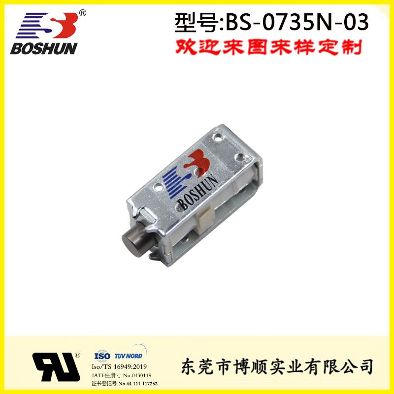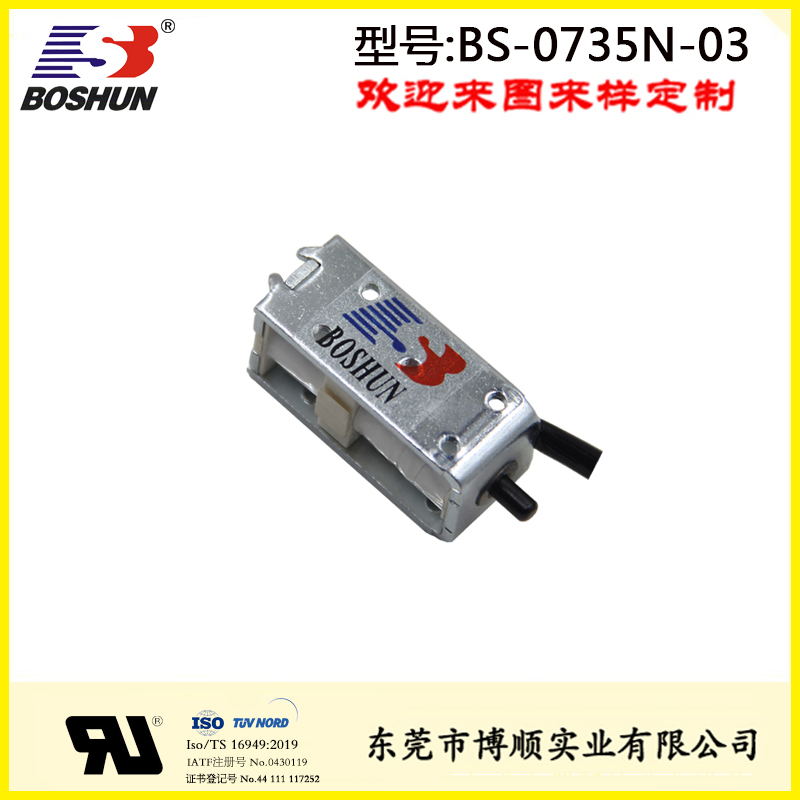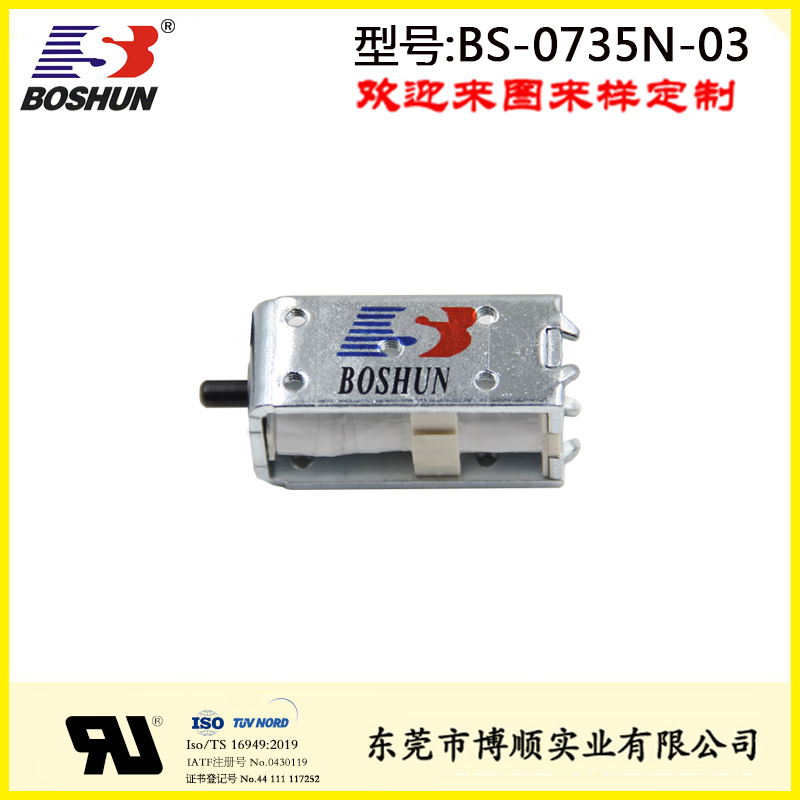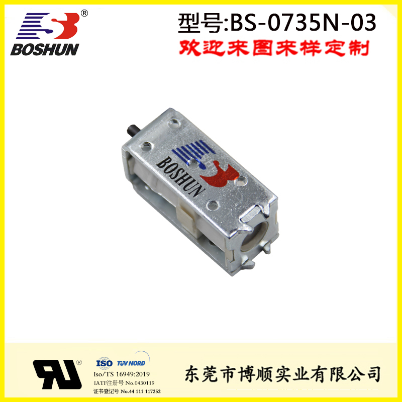 電腦橫機吊目針用電磁鐵BS-0735N-03是由東莞博順電磁鐵廠家研發設計并生產的一款電磁鐵,此電磁鐵用在電腦橫機吊目針上,具有結構可改,參數可調優點。