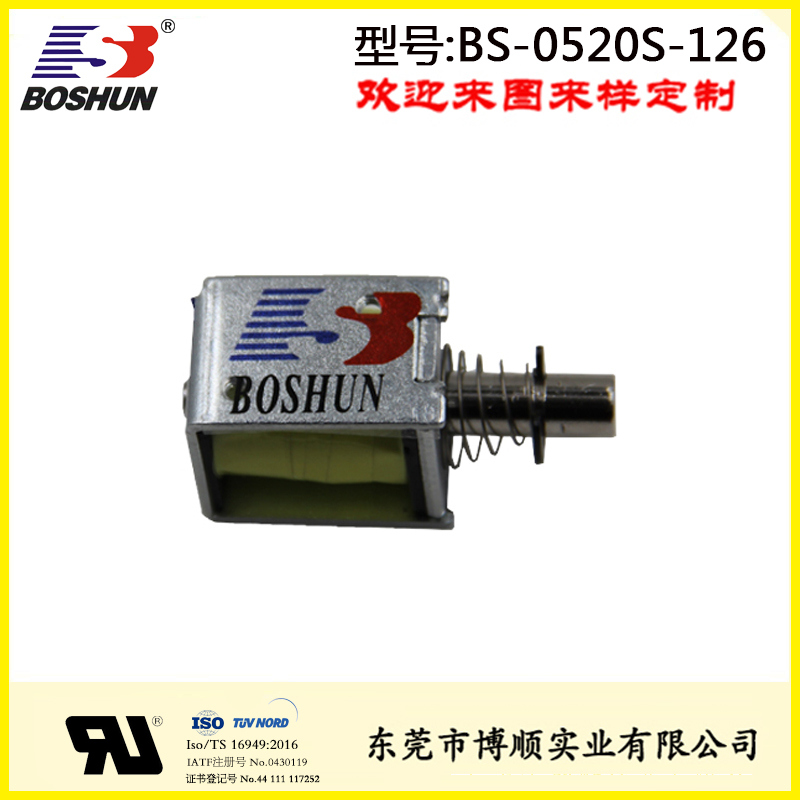 豐巢柜專用小型電磁鐵定制BS-0520S-126是由東莞博順電磁鐵廠家研發設計并生產的一款電磁鐵,此電磁鐵用在智能箱柜上,具有結構可改,參數可調優點。