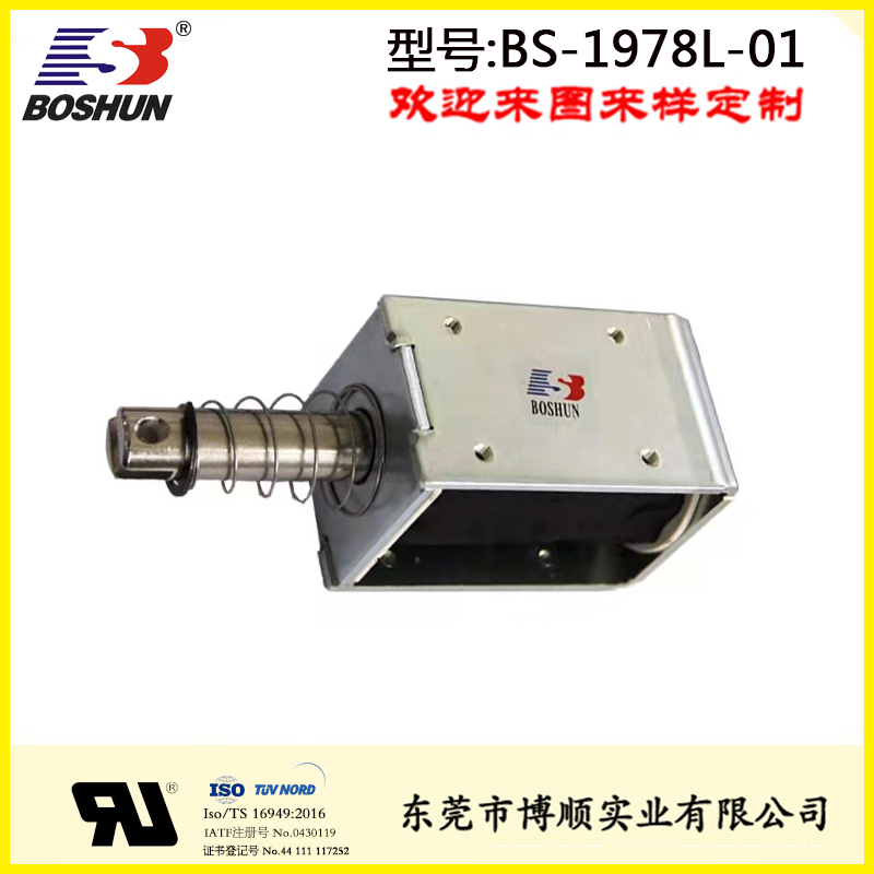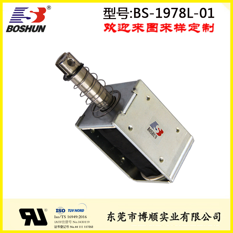 推拉式電磁鐵BS-1978-01是由東莞博順電磁鐵廠家研發設計并生產的一款電磁鐵,此電磁鐵用在自動化設備上,具有結構可改,參數可調優點。東莞博順電磁鐵廠家按照ISO-TS16949質量管理體系制作,重點工裝在生產線上全檢,以確保出貨良品率完全達到標準。