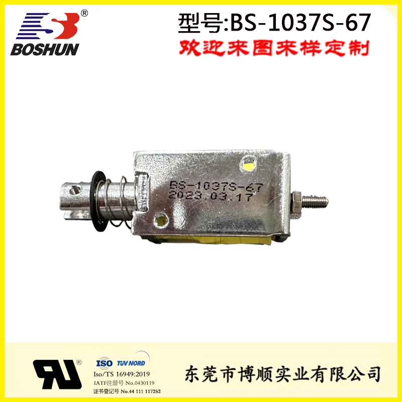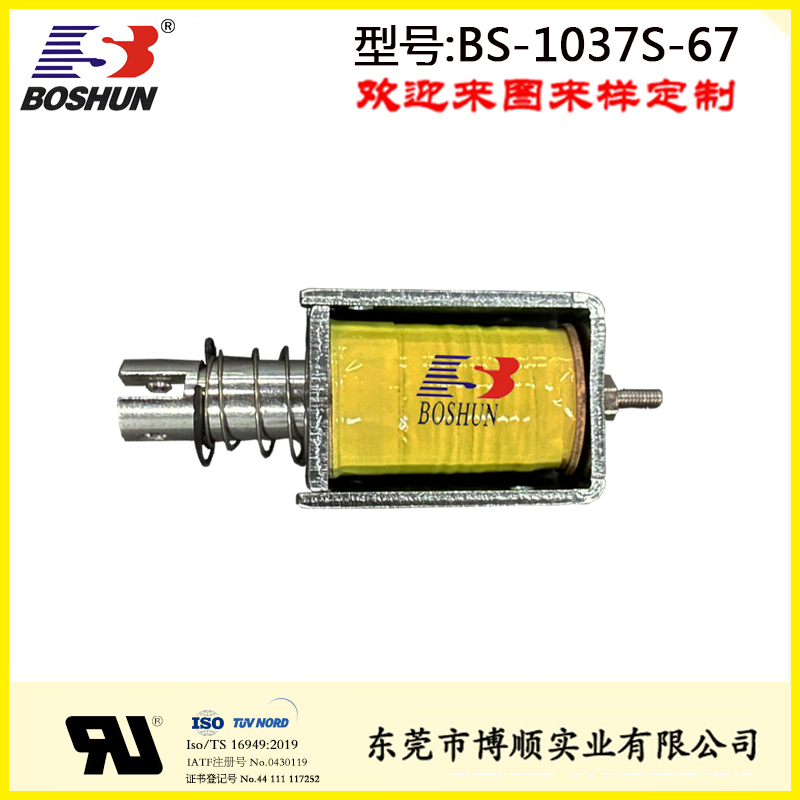 汽車點火鑰匙鎖電磁鐵BS-1037S-67是由東莞博順電磁鐵廠家研發設計并生產的一款電磁鐵,此電磁鐵用在汽車點火鑰匙鎖上,具有結構可改,參數可調優點。