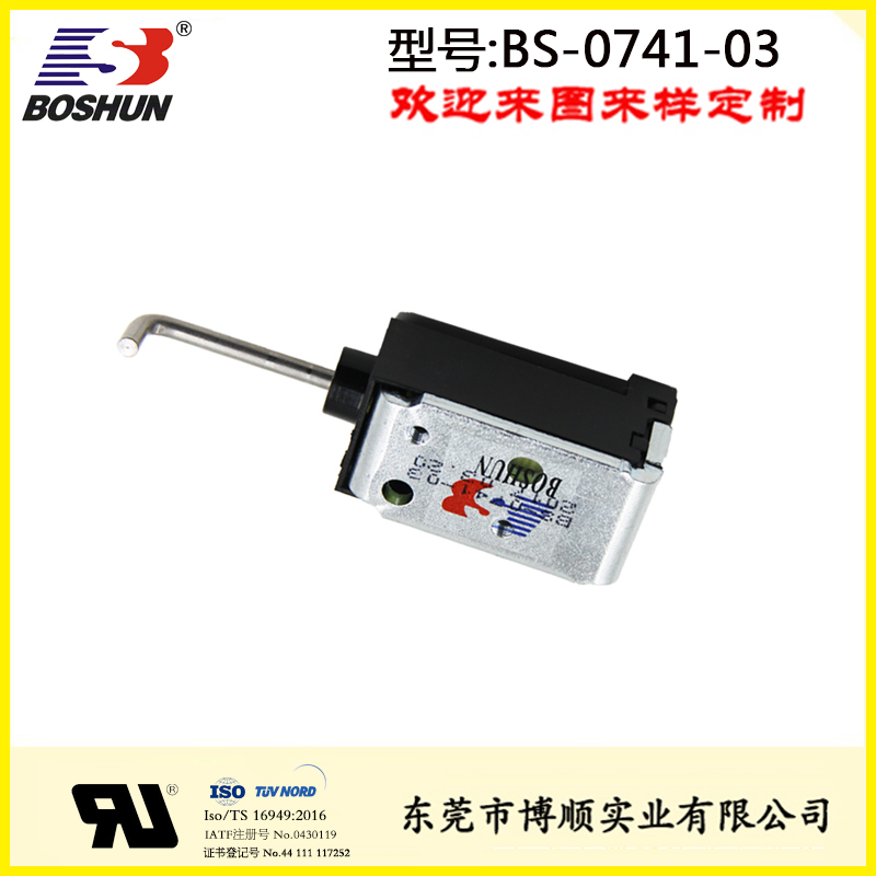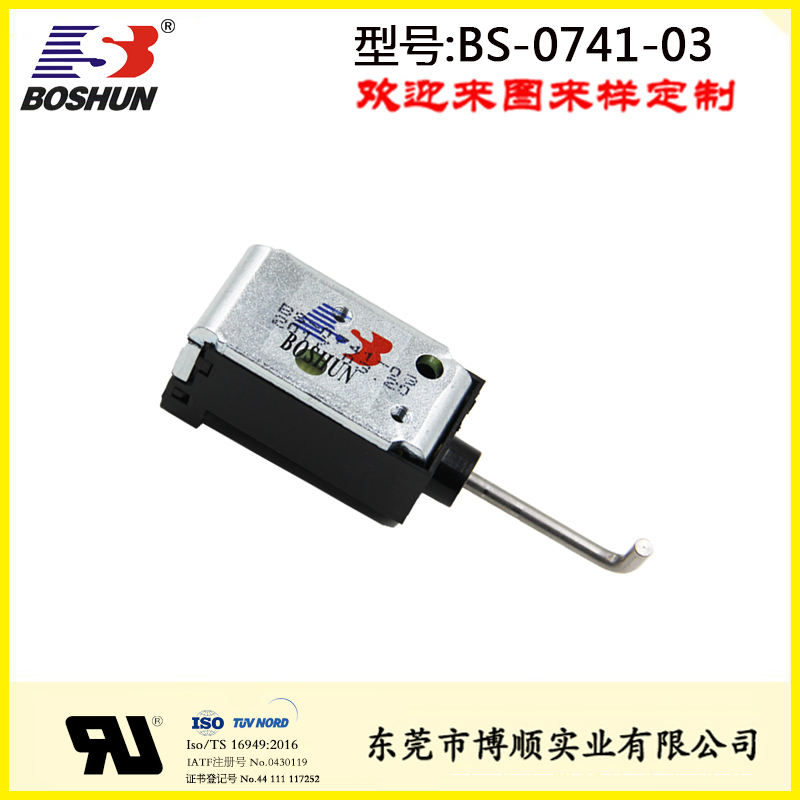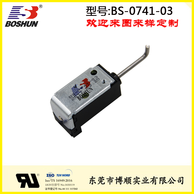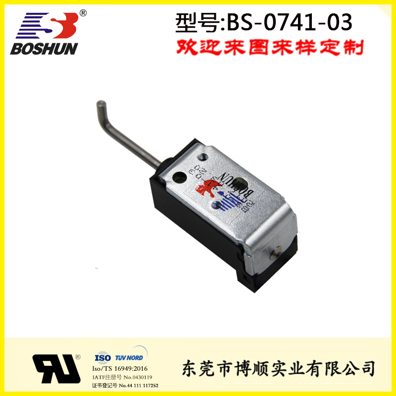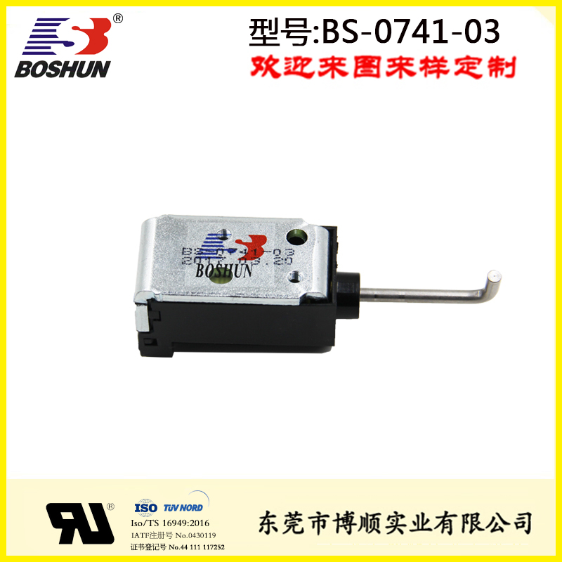 換擋器電磁鐵BS-0741L-03是由東莞博順電磁鐵廠家研發設計并生產的一款換擋器電磁鐵,此電磁鐵用在汽車換擋器上,具有結構可改,參數可調優點。