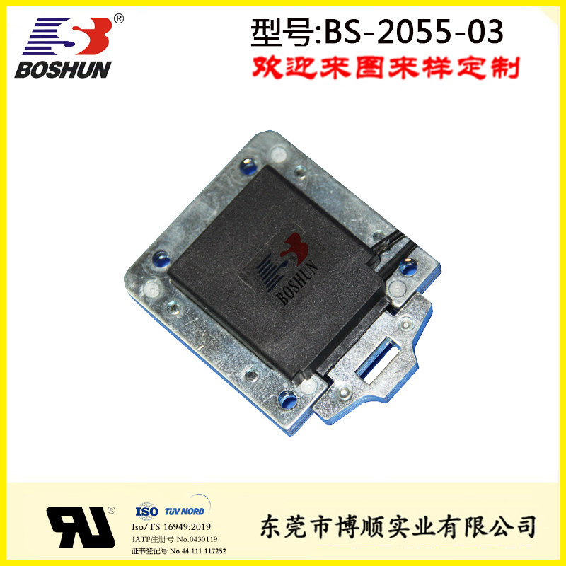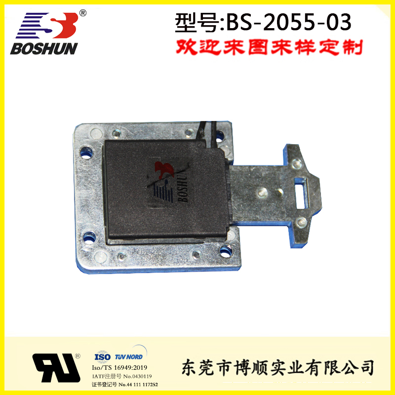 無人超市電磁鐵BS-2055-03是由東莞博順電磁鐵廠家研發設計并生產的一款電磁鐵,此電磁鐵用在無人超市售貨柜上,具有結構可改,參數可調優點。