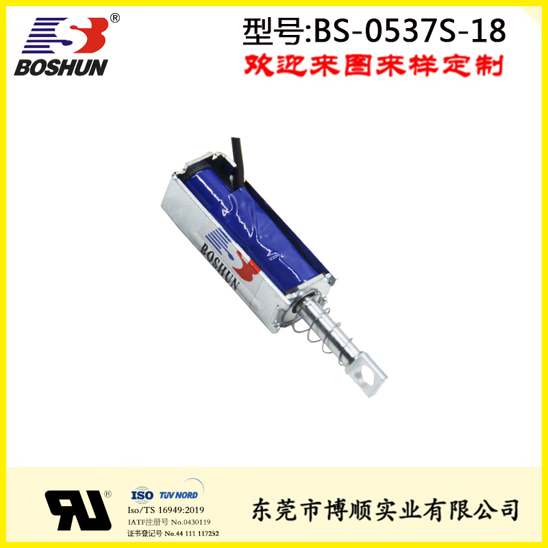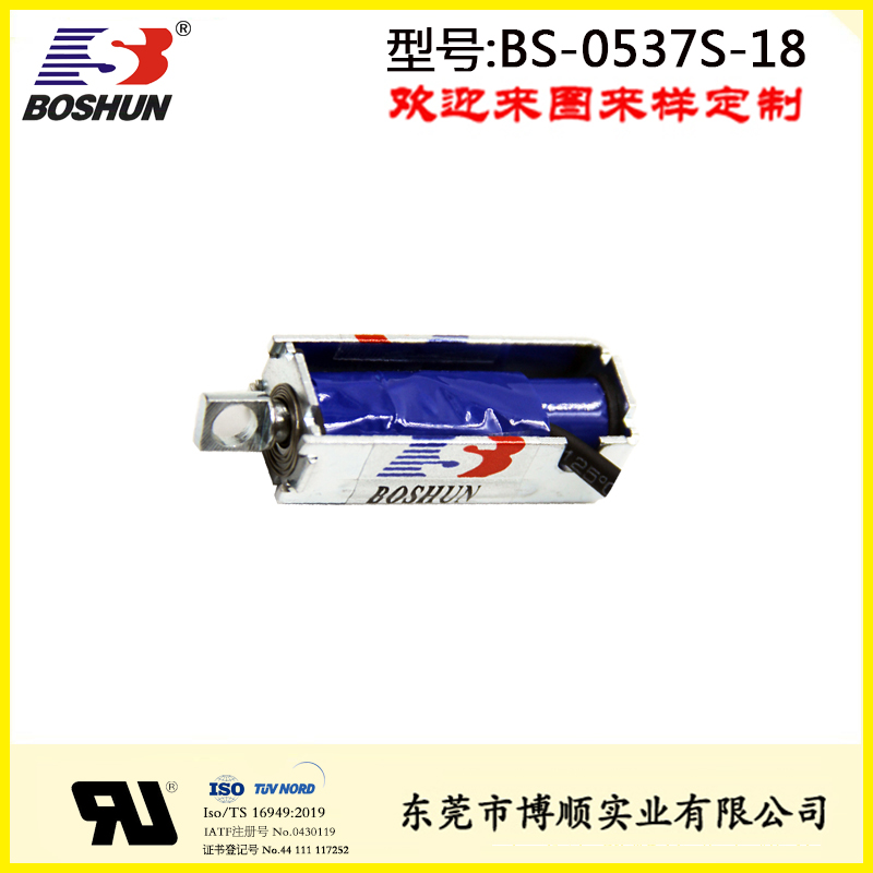 工業電子微型電磁鐵BS-0537S-18是由東莞博順電磁鐵廠家研發設計并生產的一款電磁鐵,此微型電磁鐵具有結構可改,參數可調優點。