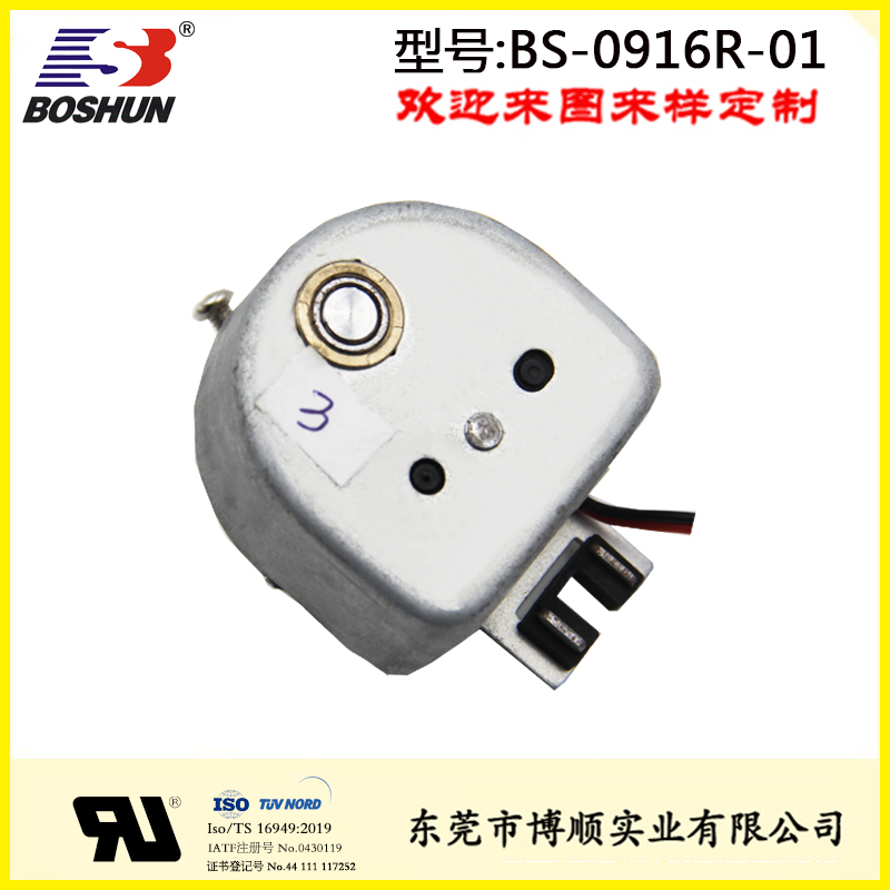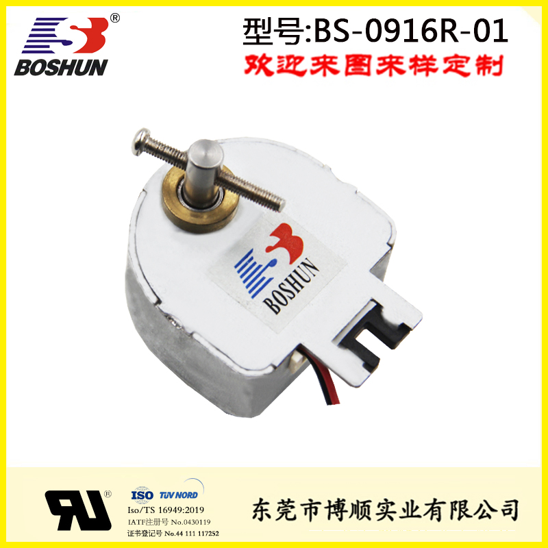 旋轉式點鈔機電磁鐵BS-0916R-01是由東莞博順電磁鐵廠家研發設計并生產的一款電磁鐵,此電磁鐵用在點鈔機上,此東莞電磁鐵具有結構可改,參數可調優點。