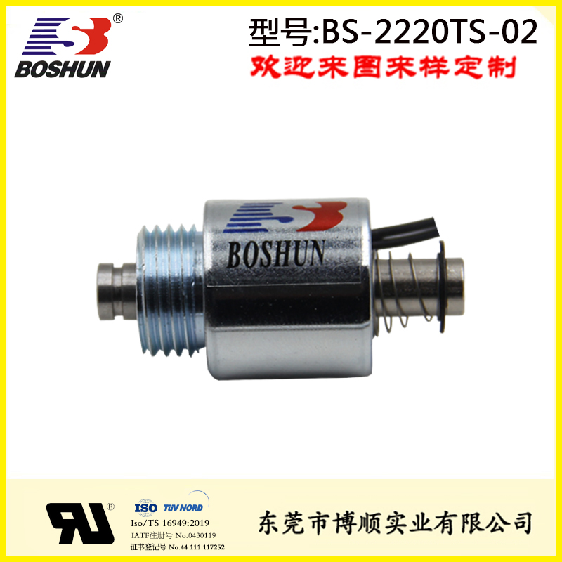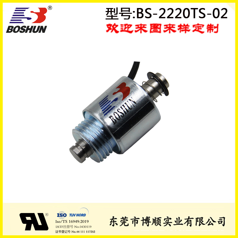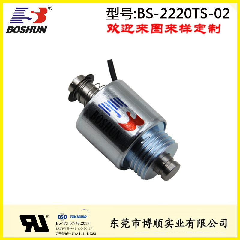 排擋鎖電磁鐵BS-2220TS-02是由東莞博順電磁鐵廠家研發設計并生產的一款電磁鐵,此電磁鐵用在汽車排擋鎖上,具有結構可改,參數可調優點。